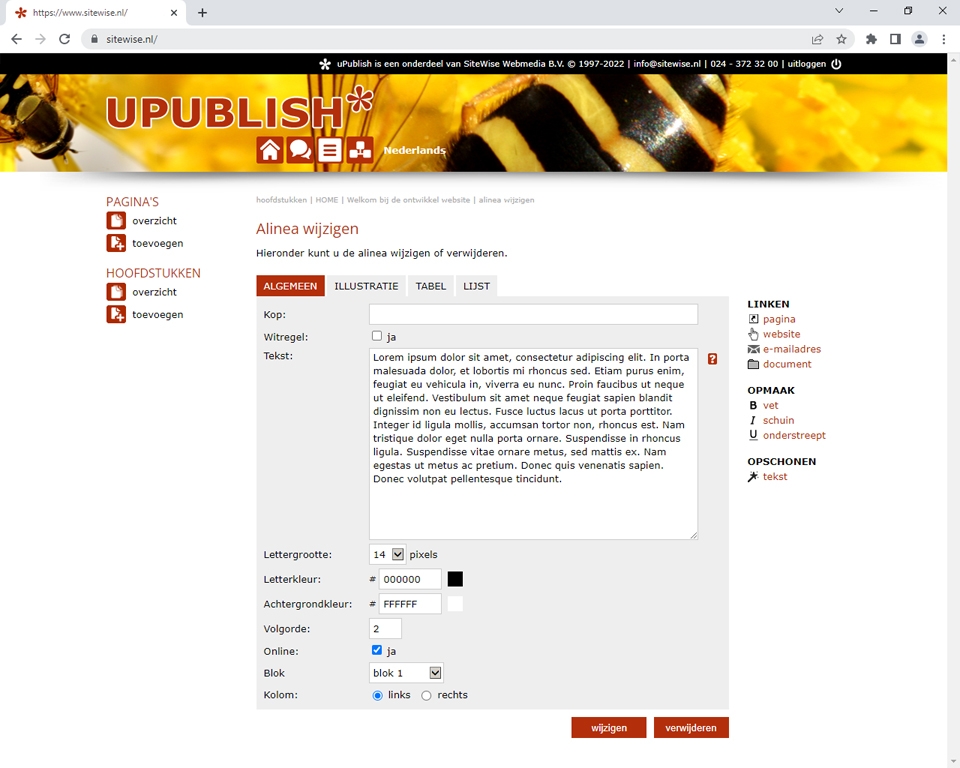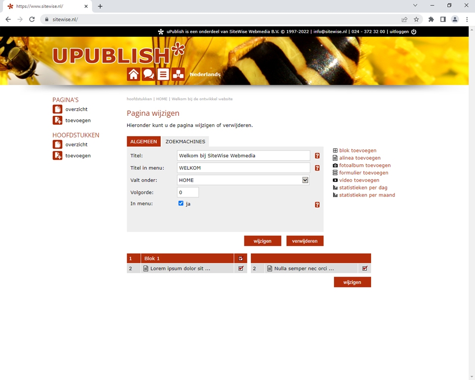 Met de Paginamodule kun je de pagina's van een website beheren. Naast alinea's met tekst en foto's, kun je ook een invulformulier en een