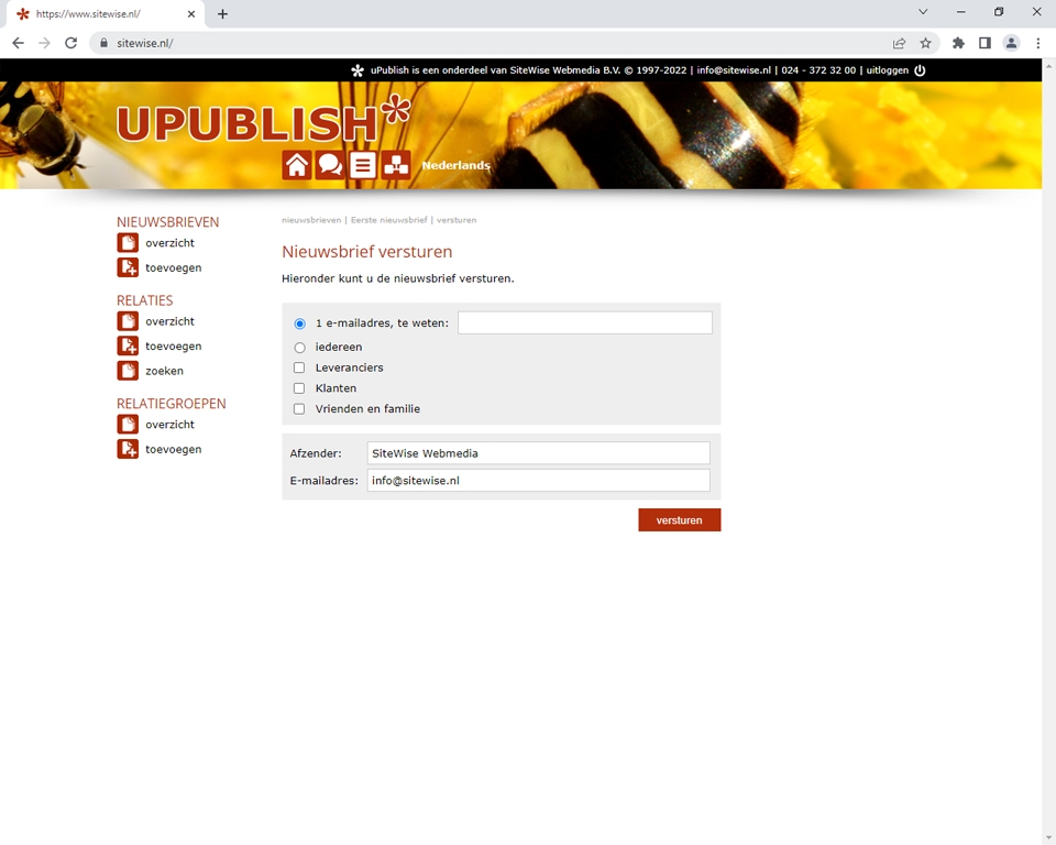 de nieuwsbrief helemaal zelf samenstelling in dezelfde vormgeving als de website. De nieuwsbrief kan daarna verstuurd worden naar