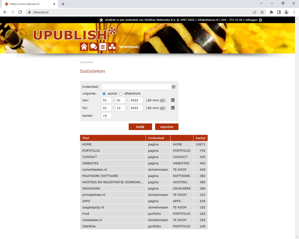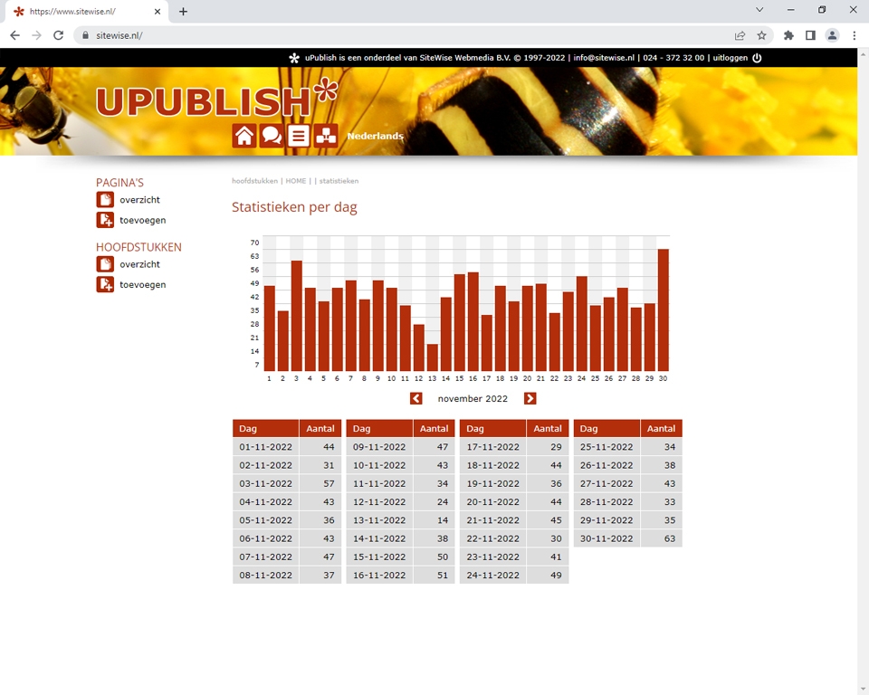 Van elke bezocht onderdeel op een website (pagina, nieuwsbericht, vacature enz) worden de statistieken bijgehouden. Je krijgt in uPublish